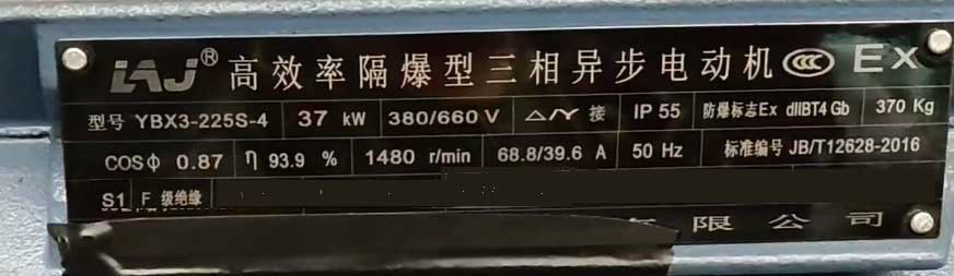 1、防爆電機(jī)型號:YBX3-225S-4防爆電機(jī);Y:代表三相異步電動機(jī),B:代表隔爆型;3:代表電機(jī)第三次設(shè)計(jì);225:表示機(jī)座號,也就是防爆電機(jī)的中心高;S:表示短機(jī)座。