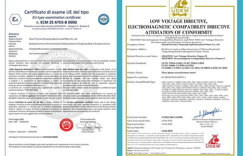 近日,河南省南洋防爆電機(jī)有限公司傳來喜訊:公司自主研發(fā)生產(chǎn)的防爆電機(jī)產(chǎn)品,順利通過權(quán)威機(jī)構(gòu)的嚴(yán)格檢測(cè)與審核,正式獲得CE認(rèn)證證書與ECM 25 ATEX-B D092證書。這兩項(xiàng)國(guó)際權(quán)威認(rèn)證的取得,不僅標(biāo)志著南洋防爆電機(jī)的產(chǎn)品質(zhì)量、安全性能達(dá)到了國(guó)際標(biāo)準(zhǔn),也為企業(yè)進(jìn)一步拓展海外市場(chǎng)奠定了堅(jiān)實(shí)基礎(chǔ)。